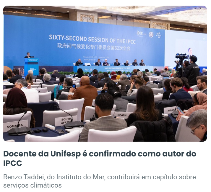 Renzo Taddei, professor do Instituto do Mar da Universidade Federal de São Paulo (Unifesp), foi confirmado em agosto como autor principal (lead author) do Painel Intergovernamental sobre Mudanças Climáticas da ONU (IPCC). O IPCC é a mais importante instância científica internacional dedicada a revisar o conhecimento produzido sobre as mudanças climáticas, com a missão de elaborar relatórios que orientem governos, empresas e sociedade civil na construção de soluções para a crise climática. Esses documentos são a principal base científica das Conferências do Clima da ONU (COPs), cuja 30ª edição ocorrerá em novembro deste ano, em Belém (PA).