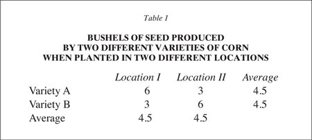 Keller’s rather casual treatment of the interaction between causal factors in the case of the drummers, despite her very great sophistication in analyzing the meaning of variation, is a symptom of a fault that is deeply embedded in the analytic training and thinking of both natural and social scientists. If there are several variable factors influencing some phenomenon, how are we to assign the relative importance to each in determining total variation? Let us take an extreme example. Suppose that we plant seeds of each of two different varieties of corn in two different locations with the following results measured in bushels of corn produced (see Table 1).