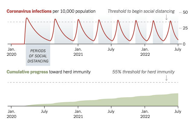 Quando uma quantidade grande de pessoas tiver adoecido ou se infectado mesmo sem sintomas, os contatos entre portadores e pessoas que não tiveram a doença começam a se tornar raros. Num cenário em que pessoas sobreviventes da infecção fiquem imunes àquele agente, sua proporção cresce e a transmissão se torna cada vez mais rara. Assim, a curva, que vinha subindo, fica horizontal e começa a cair, podendo até mesmo chegar a zero, situação em que o agente deixa de circular.