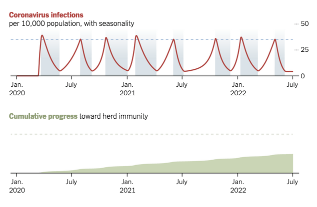 Em populações grandes, é muito raro que uma doença seja completamente eliminada desta forma, por isso a incidência cresce novamente de tempos em tempos. Quando a quantidade de pessoas que não se infectaram, somada à dos bebês que nascem e pessoas sem imunidade que vieram de outros lugares é suficientemente grande, então a curva sobe novamente.