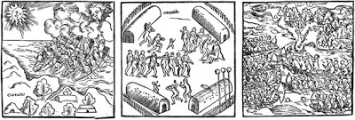 Os tupinambá trazem o prisioneiro (a partir da esquerda); duas mulheres dançam ao redor da fogueira. A vítima é desmembrada. Sua cabeça é fervida; Staden está presente e reza