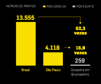 No caso brasileiro, os mais de 13 mil mortos fazem desastres como o de Brumadinho ficarem pequenos. Teriam que ter ocorrido 52 acidentes iguais ao da cidade mineira para alcançar a mortalidade. O mesmo pode ser dito do massacre do Carandiru. Seriam precisas 122 chacinas para que o número de mortos se igualasse ao do país. Já São Paulo teria que lutar quatro Revoluções Constitucionalistas para igualar as baixas.