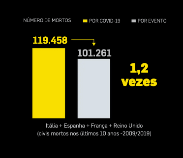 Na Europa, continente com mais mortos até o momento, somados os quatro países mais afetados pela pandemia – Reino Unido, Itália, França e Espanha – o número de vítimas é maior do que o total de civis mortos nos últimos dez anos da Guerra do Iraque (2009-2019).