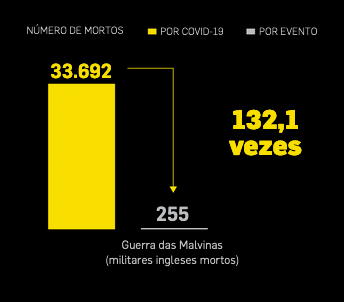 O Reino Unido, que tomou o posto da Itália de país mais afetado pela pandemia no continente, teria que lutar mais de 130 Guerras das Malvinas para ter o mesmo número de baixas provocadas pelo coronavírus. Se contarmos o número total de mortos na guerra (britânicos e argentinos), seriam necessários mais de 36 conflitos idênticos ao disputado no Atlântico sul.